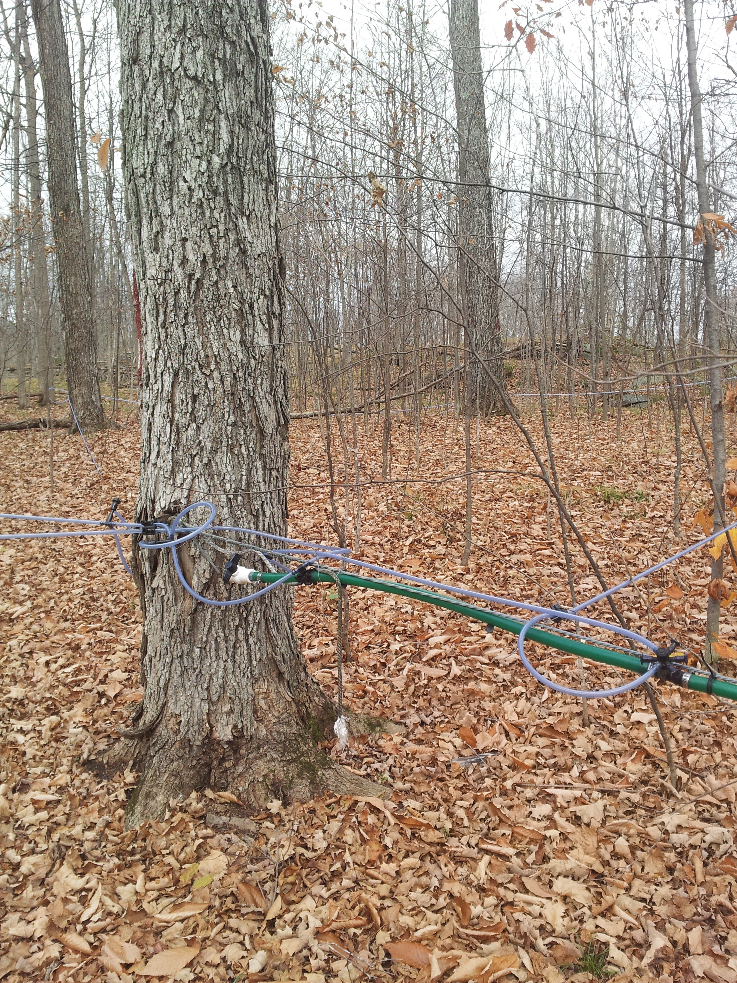 The maple trees are tapped and the sap begins to flow in the spring during the thaw. The individual tree tap lines run into larger collector lines.