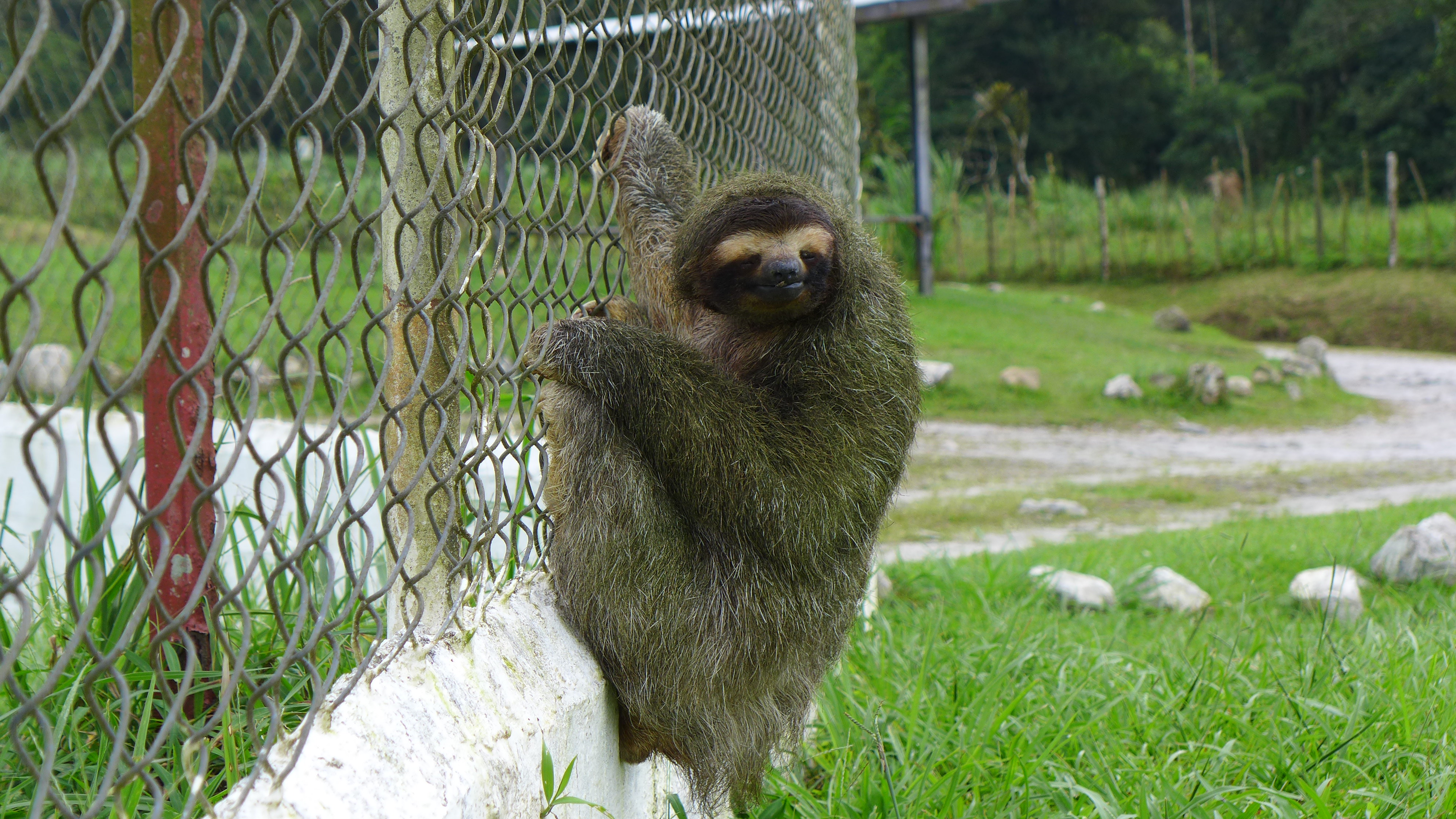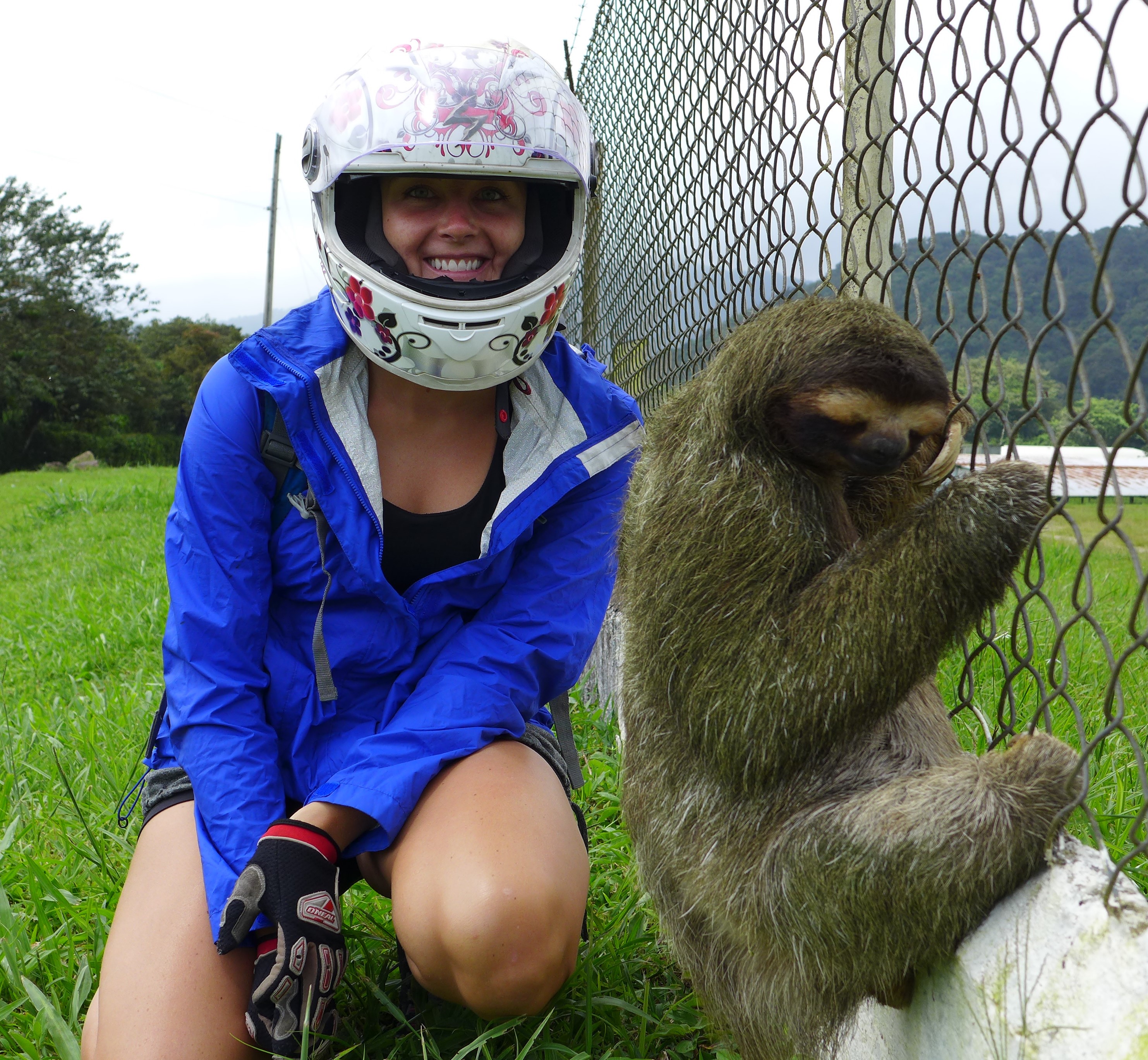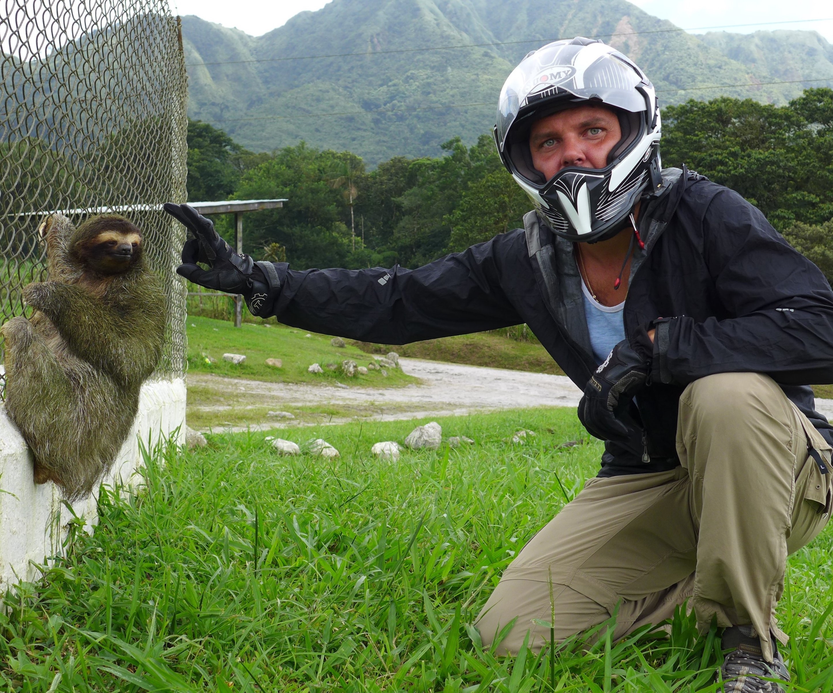 We decided while out and about to continue riding further on up into the mountains to see what we could find. As we rolled along I spotted a furry creature clinging to a chain link fence so we pulled over to take a closer look. That’s when we met this friendly sloth hanging out waiting to have his picture taken with the Canadian kids.